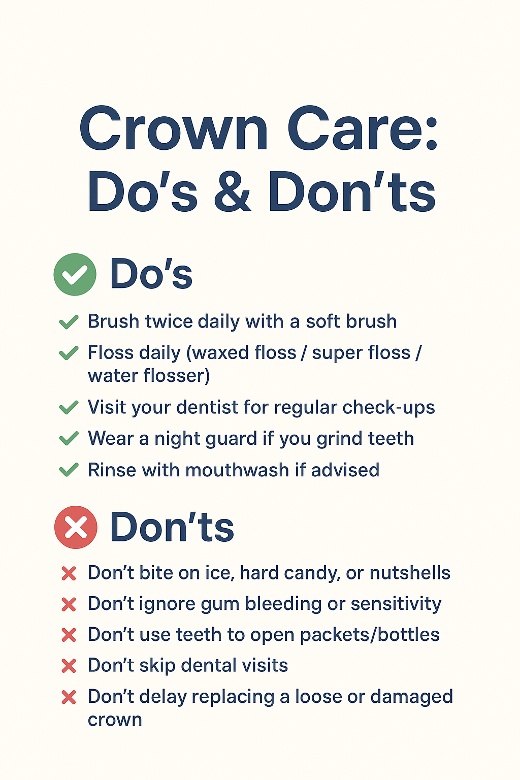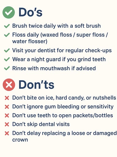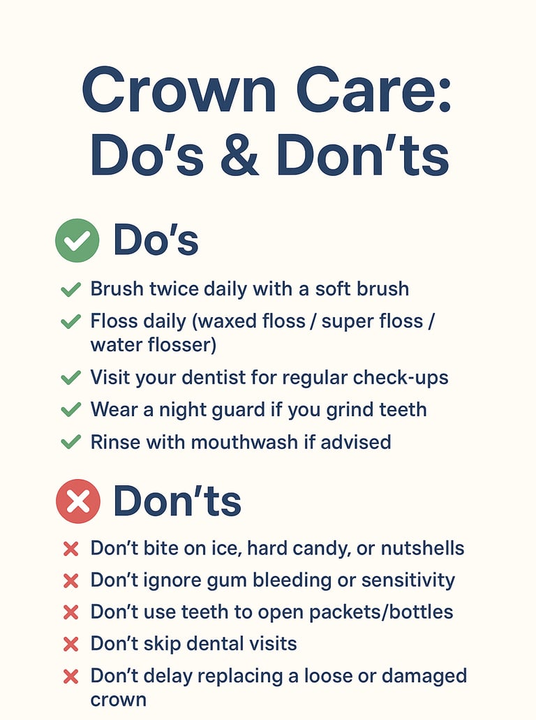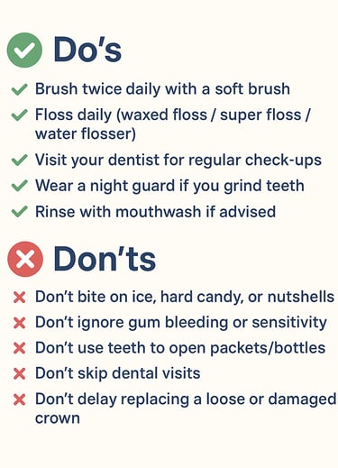 ✨ Takeaway: A crown can last for many years with the right care. Gentle brushing, mindful flossing, and regular dental visits protect not only your crown but also your overall oral health.